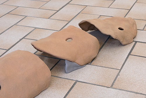 Andrew Hoekstra, Feelers From the Grotto (detail), 2018, ceramic, 3-D printed polyjet, golf balls, walnuts, Fisherman’s Friend, assorted seeds, glove, mesh