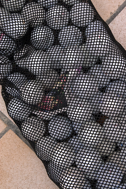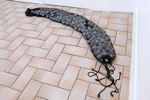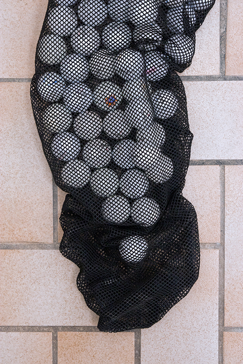 Andrew Hoekstra, Feelers From the Grotto, 2018, ceramic, 3-D printed polyjet, golf balls, walnuts, Fisherman’s Friend, assorted seeds, glove, mesh